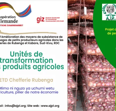 Grâce à l'appui de la GIZ, AJP asbl contribue à transformer la vie de 120 ménages vulnérables des chefferies de Kabare et Rubenga en améliorant leur capacité de production, de transformation et de commercialisation. L'installation d'unités de transformation à Rubenga et de séchoirs à oignons à Kabare renforce la résilience économique des communautés rurales en leur offrant des moyens durables pour améliorer leurs conditions de vie.